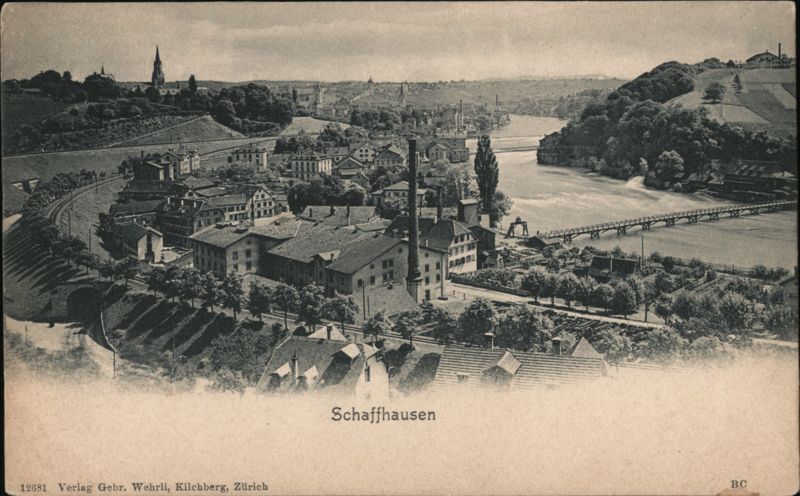 | A panoramic view of Schaffhausen, Switzerland, showcasing the cityscape with a prominent river and bridge. The image captures various buildings, including industrial structures with a chimney, and a railway line. The river flows through the city, spanned by a bridge, and the surrounding landscape includes hills and vegetation. |