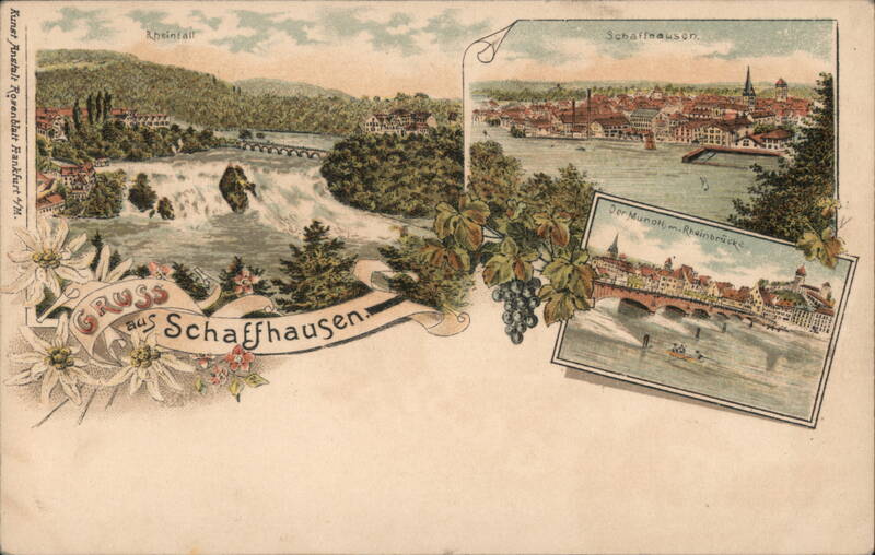 Front: Kunst Anstalt Rosenblatt Frankfurt A/M. Rheinfall RUSS aus Schaffhausen Schaffhausen. Der Munothm. Rheinbrücke. Back: Côté réservé à l'adresse. POSTKARTE. Carte postale.-Cartolina postale. Nur für die Adresse. Lato riservato all' indirizzo.