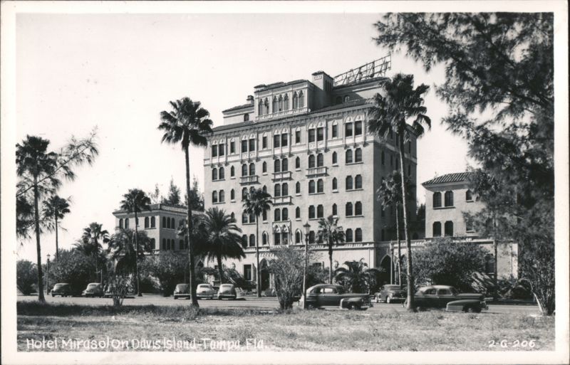 Black and white photo of Hotel Mirasol on Davis Islands in Tampa, Florida. Several cars are parked in front of the hotel. Palm trees and other foliage are visible.