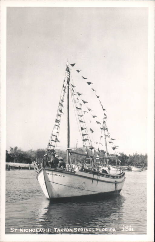 | Black and white photograph of a sailboat named "St. Nicholas III" adorned with numerous small flags, possibly for a celebration or regatta. The boat is situated in a calm body of water, likely a harbor or bay, with other boats and a shoreline with trees visible in the background. |