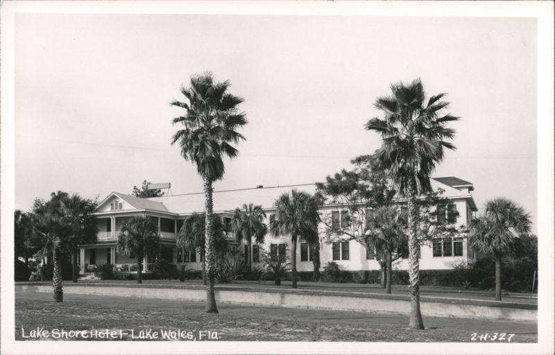 Black and white photo of the Lake Shore Hotel in Lake Wales, Florida. The hotel is a two-story white building with a large porch. There are palm trees in front of the hotel and a lawn in front of the porch.