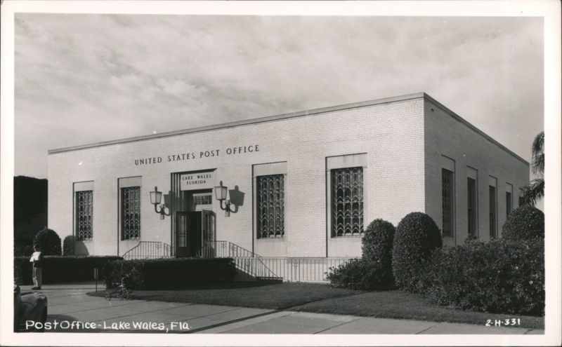 | A clear view of the Lake Wales, Florida, United States Post Office building. A young boy stands on the sidewalk near the building's entrance. A tricycle rests nearby on the grass. Ornamental grilles cover the windows, and shrubs and bushes line the building's front. The building is constructed of light-colored brick. |