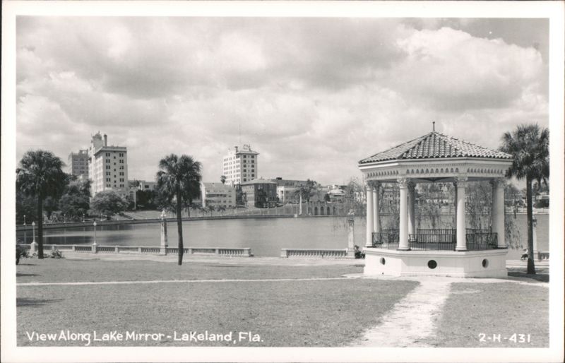 | A picturesque view of Lake Mirror in Lakeland, Florida, featuring a charming gazebo in the foreground and the skyline of downtown Lakeland in the background. The calm lake waters reflect the buildings and the sky, creating a serene atmosphere. Palm trees and lush greenery frame the scene, adding to the tropical ambiance. |