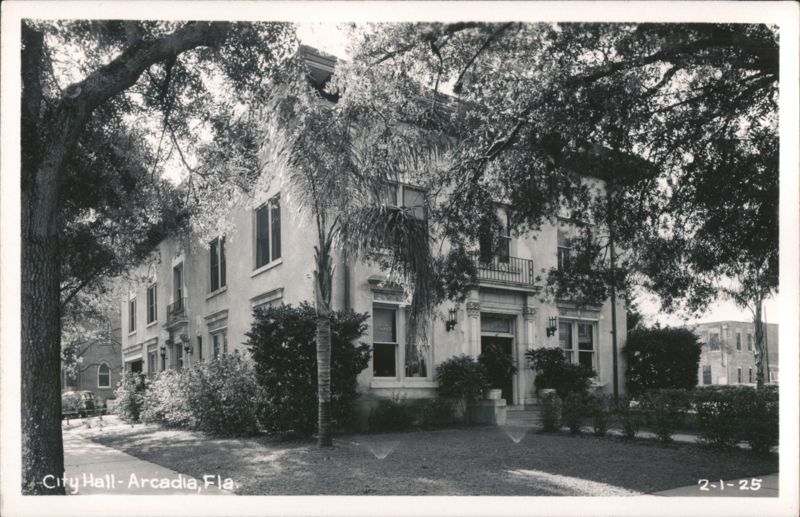 | Black and white photo of the City Hall building in Arcadia, Florida. The building is a two-story stucco structure with a Spanish-style tile roof. There are trees and shrubs in front of the building, and a sidewalk leads up to the entrance. A car is parked on the street in front of the building. |