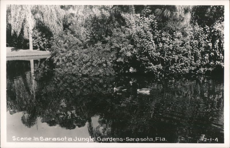 Two geese swim in a pond at the Sarasota Jungle Gardens. Lush foliage and trees surround the pond, creating a serene and natural setting. The reflection of the trees and plants can be seen in the still water of the pond.