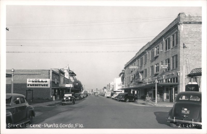 | A street scene in Punta Gorda, Florida, featuring Nobles Furniture store and the Princess Hotel. Several period cars are parked along the street. Western Union signs are visible on the hotel building. Utility poles and wires line the street. |