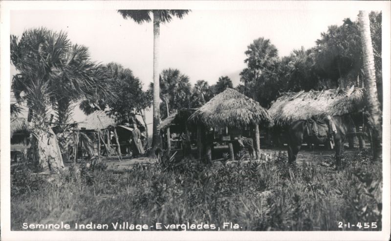Black and white photo of a Seminole Indian village in the Everglades. Several thatched-roof chickees are visible, with a pack horse standing near one of them. Lush vegetation and palm trees surround the structures.