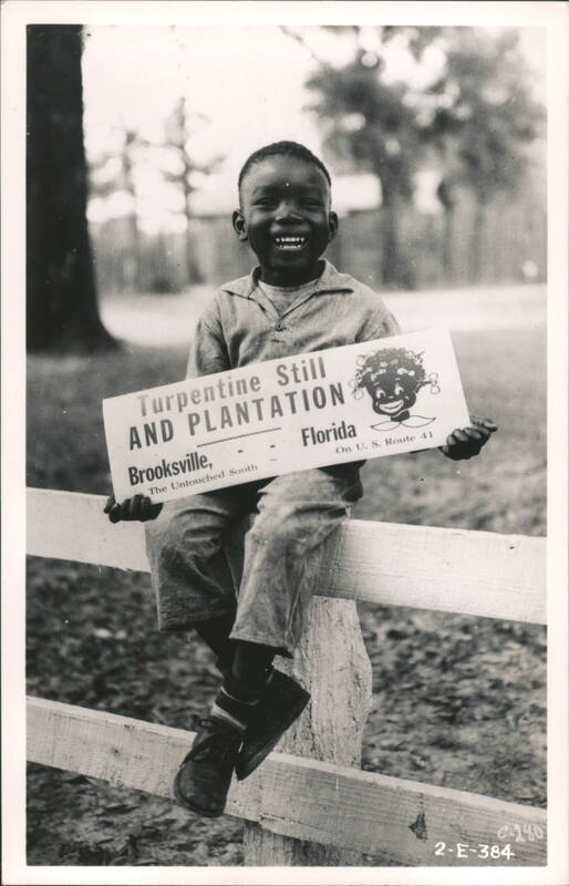 | A young Black boy sits on a white fence, holding a sign advertising the Turpentine Still and Plantation in Brooksville, Florida. He is wearing a light-colored shirt and darker pants, and is smiling broadly. The sign includes a caricature of a Black child's face with exaggerated features. The text on the sign reads "Turpentine Still AND PLANTATION Brooksville, Florida The Untouched South On U.S. Route 41" |