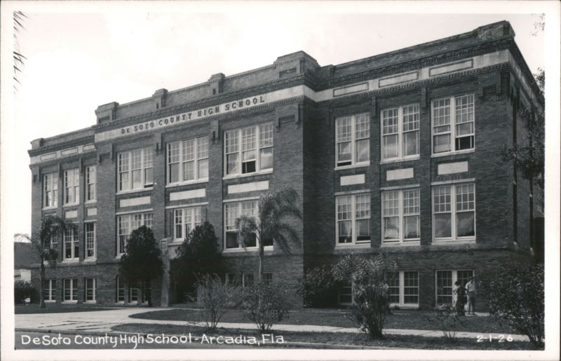 | A real photo postcard featuring De Soto County High School in Arcadia, Florida. Two individuals can be seen standing near the building's corner in the foreground. The school's name is clearly visible at the top of the building. The postcard is dated 2-1-26. |