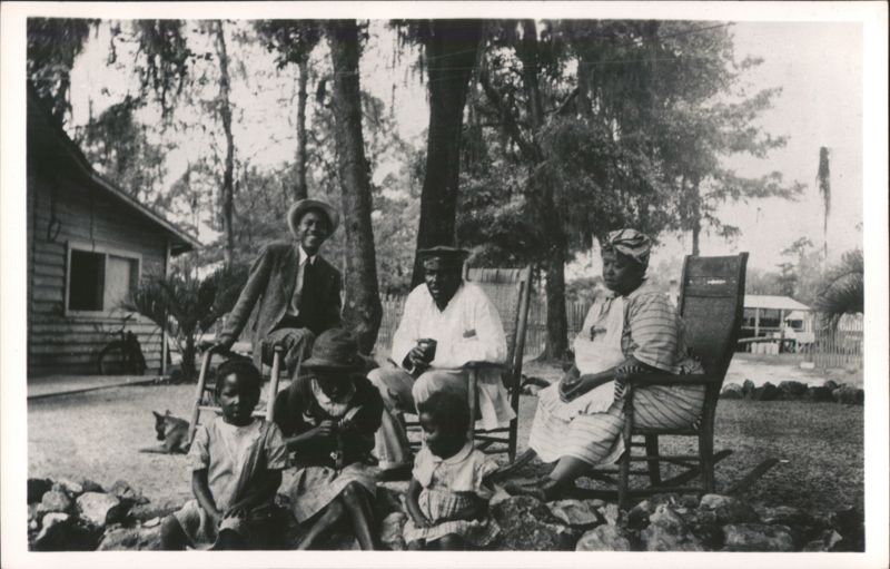 | A black and white real photo postcard featuring a family portrait. Two adults are seated in rocking chairs, a man in a suit and hat, and a woman in a striped dress and headwrap. Three children are seated in front of them, two girls in dresses and a younger child in a ruffled outfit. A dog lies on the ground near the children. A wooden house is visible in the background, along with trees and a partial view of a fence. The family appears relaxed and posed for the photograph. |
