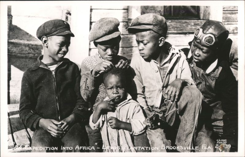 | Four young African American boys, three wearing hats, and one wearing a leather aviator cap and goggles, pose for a photo. A younger child, also African American, stands in front of them. The photo appears to be taken on a plantation, possibly during a break or after work. The children's expressions range from curious to playful, offering a glimpse into their lives. |