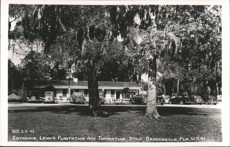| Black and white photo of the entrance to the Lewis Plantation and Turpentine Still in Brooksville, Florida. Several cars are parked in front of the building, and a tent is visible on the left side of the image. Large oak trees with Spanish moss are in the foreground. |