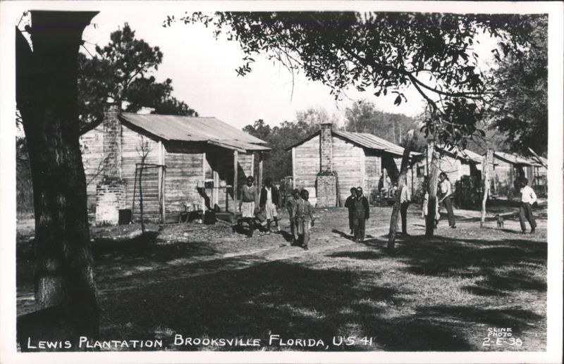 Black and white photo of several small homes on the Lewis Plantation in Brooksville, Florida. Several children are walking in the dirt road and yard in front of the homes. A dog is also visible. A large tree is partially visible in the foreground on the left. Cline Photo is printed in the lower right corner. |