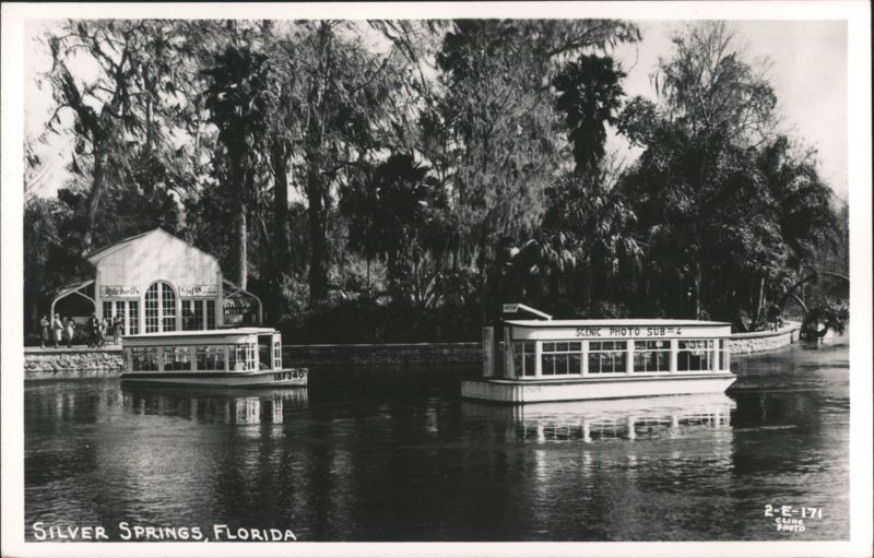 | Two glass-bottom boats are shown on the water. One boat is close to the shore with people standing nearby. The other boat is further out on the water. Trees and other vegetation are visible along the shore. A building with the words "Mitchell's Gifts" is visible on the shore. |