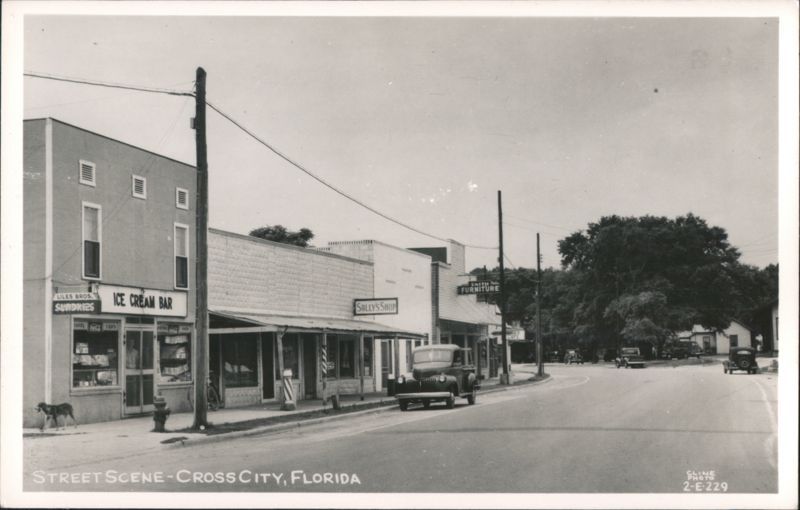 | A view of a street scene in Cross City, Florida. Several businesses are visible, including Liles Bros. Sundries, an ice cream bar, Sally's Shop, and Smith Furniture. A vintage truck is parked on the street, and a dog is walking on the sidewalk. Several other vehicles are visible in the distance. A barber's pole is also visible in front of one of the businesses. |