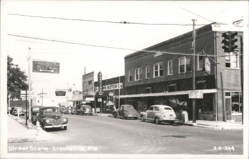 | A view of a street in Brooksville, Florida, lined with businesses and parked cars. The Tangerine Hotel sign is visible, along with signs for Pontiac, a motor company, and various shops. The street is paved with bricks, and there are power lines overhead. A traffic light is visible at the intersection. |