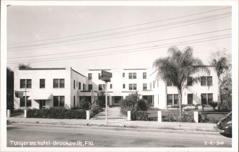 | The Tangerine Hotel in Brooksville, Florida. The hotel is a two-story, white stucco building with a flat roof. There are two wings to the hotel, with a central entrance. The entrance has a sign that reads "Tangerine Hotel". There are bushes and trees in front of the hotel. A car is parked on the street in front of the hotel. Power lines run above the street. |