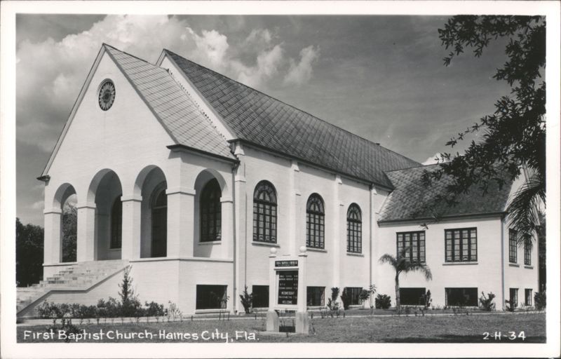Black and white photo of the First Baptist Church in Haines City, Florida. The church is a white brick building with arched entryways and a tiled roof. A sign in front of the church lists the service times. Trees and landscaping are visible around the building. |