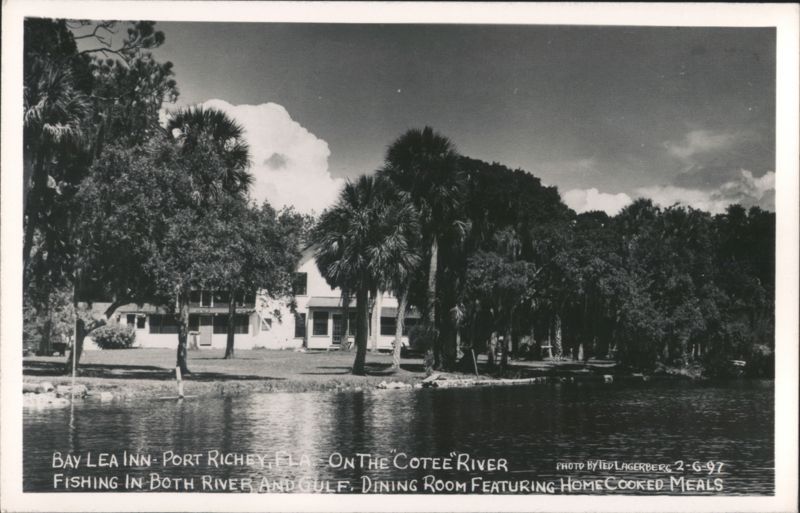 | Black and white, Real Photo Postcard featuring the Bay Lea Inn, located on the Cotee River in Port Richey, Florida. The inn is a white, two-story building situated amidst palm trees and other vegetation. The Cotee River is visible in the foreground, and a forested area can be seen on the opposite bank. The caption mentions fishing in both the river and gulf, and a dining room serving home-cooked meals. |