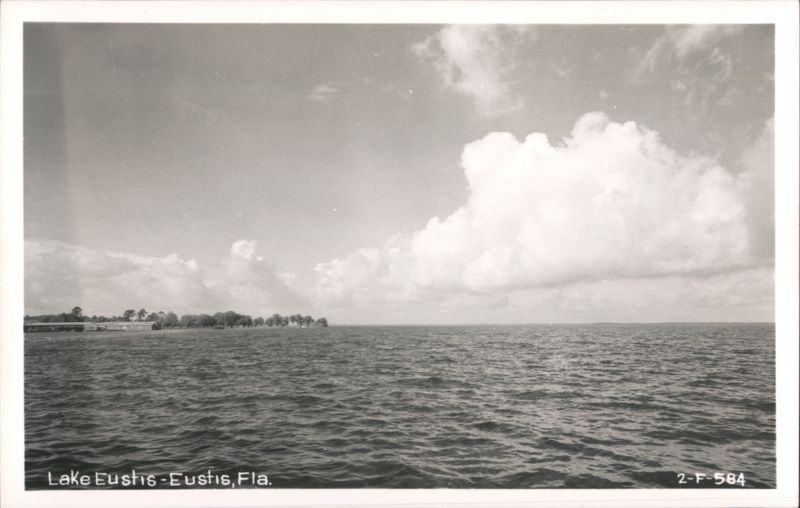 A scenic view of Lake Eustis in Florida. The photograph captures the vast expanse of the lake's calm waters, with gentle ripples suggesting a slight breeze. The distant shoreline is visible, dotted with trees and a few buildings. The sky is a mix of light and dark clouds, creating an interesting contrast with the serene lake below. |