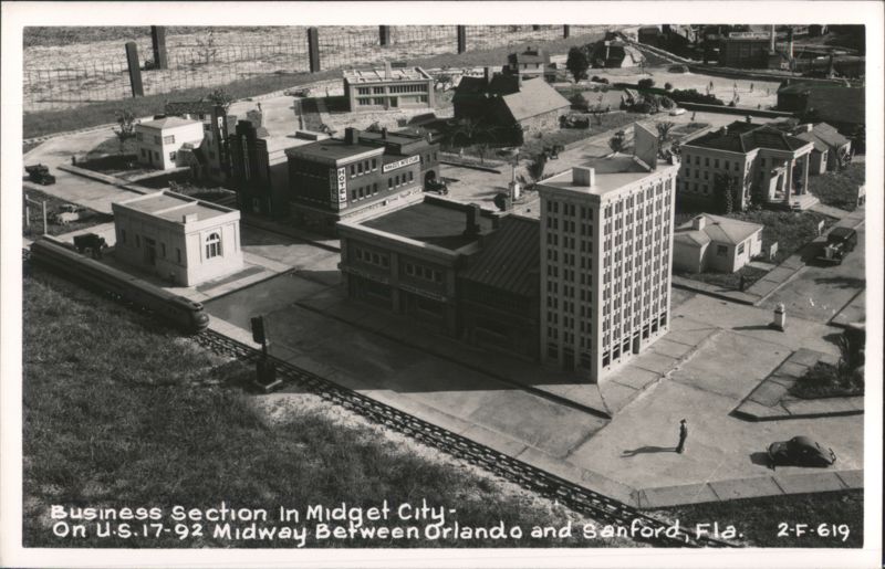 Overhead view of the miniature buildings and streets of Midget City, a roadside attraction located midway between Orlando and Sanford, Florida. A model train is visible, along with miniature cars and a small figure of a person.