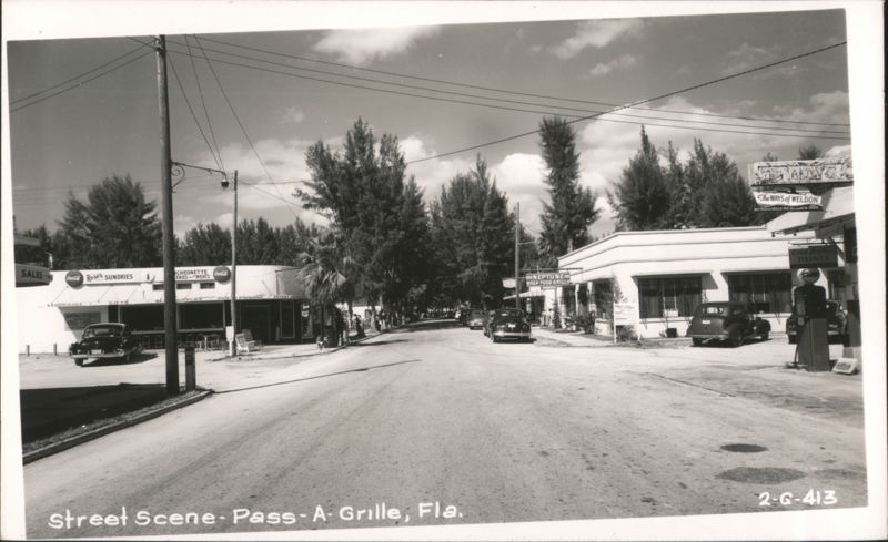 A view of a street in Pass-A-Grille, Florida, lined with various businesses, including Rose's Sundries, a luncheonette, and the Neptune Sea Food Grill. Cars are parked along the street, and overhead wires crisscross the sky.