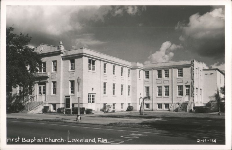 First Baptist Church in Lakeland, Florida. The church is a two-story brick building with white trim. There is a sign on the front of the church that reads "First Baptist Church". There are trees and bushes in front of the church. There is a street in front of the church with a "SLOW" sign painted on it. |