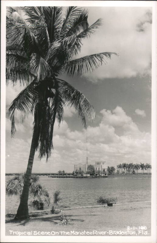 A black and white photograph of a tropical scene on the Manatee River in Bradenton, Florida. A large palm tree is in the foreground on the left, with a view of the river and a building with a tall antenna in the background. Additional palm trees line the far shore.