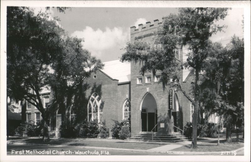 | Black and white photo of the First Methodist Church in Wauchula, Florida. The church is a brick building with a tall, crenelated tower. The church has a large arched entrance and several arched windows. There are trees and shrubs in front of the church. The photo is taken from across the street. |