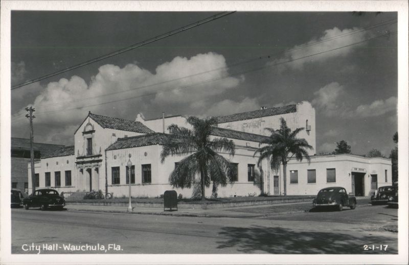 Black and white photo of the Wauchula City Hall in Florida. Several cars are parked on the street in front of the building. A mailbox and lamppost are visible on the sidewalk. Two palm trees are in front of the building.