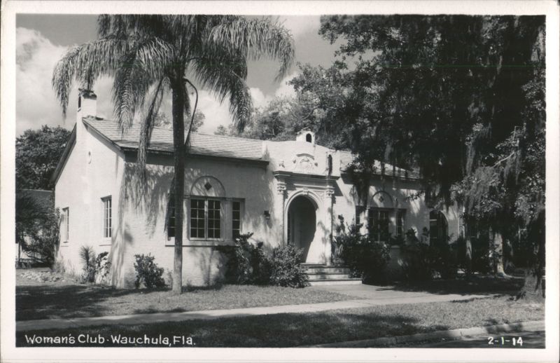 | Black and white photo of the Woman's Club building in Wauchula, Florida. The building is a white stucco Spanish-style structure with a tiled roof, arched windows and doorway, and decorative elements. A tall palm tree stands in the yard, casting shadows on the building. Mature trees and landscaping surround the building. A sidewalk and street are visible in the foreground. |