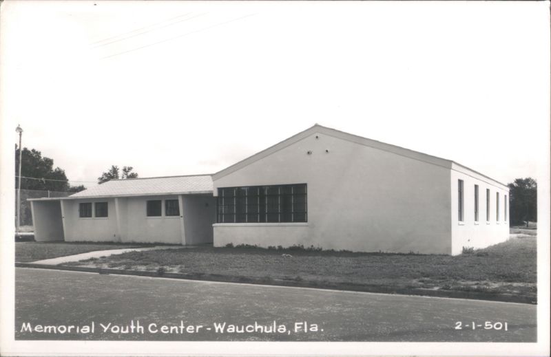 | Black and white photo of the Memorial Youth Center in Wauchula, Florida. The building is a single-story, rectangular structure with a flat roof and a slight overhang. The exterior walls appear to be stucco or concrete. There are multiple windows along the front and side, some of which are large, multi-paned windows. A walkway leads to the entrance. The surrounding area has grass and a paved street or driveway in front of the building. |
