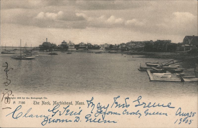 Front: ས་ཐང་ག་རེད་ Copyright 1905 by the Rotograph Co. A 7186 The Neck, Marblehead, Mass. Jerome d. & genomen Morley Gelle Aug25 19005 Back: The Rotograph Co., N. Y. City, (Germany.) Two cents