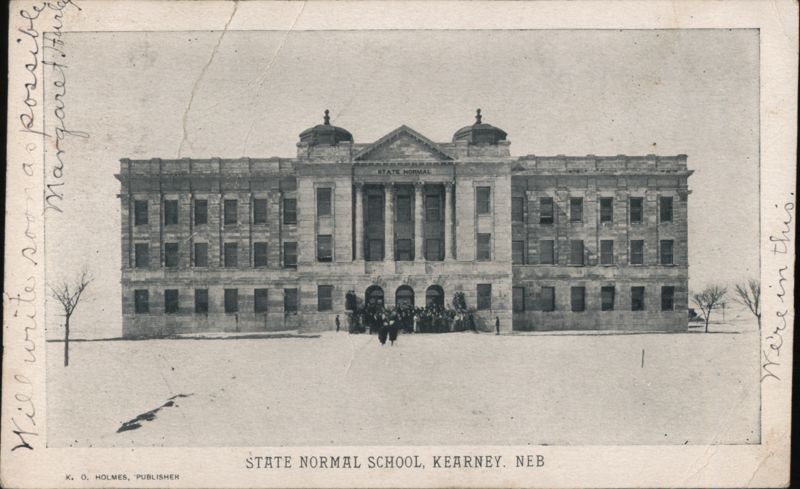 Front: Will write. soona possible K. O. HOLMES, PUBLISHER STATE NORMAL SCHOOL, KEARNEY. NEB STATE NORMAL We'r in this. Back: 23 | tt 1907 NEB Miss for Barney Madison Nebraska. NEKIEN 1902 UNITED STATES OF AMPERENCA s FR ALIN 1790 340 STAGE CENT