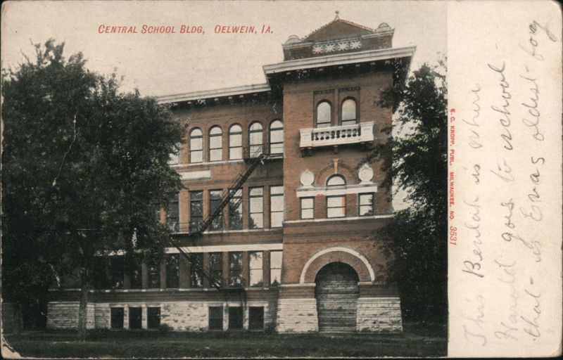 Front: CENTRAL SCHOOL BLDG, OELWEIN, IA. **** 1898 ONE ON 3 This Beulah is where Harold goes to school. •that is Evas oldest forg Back: Post-Gard THIS SIDE FOR THE ADDRESS.