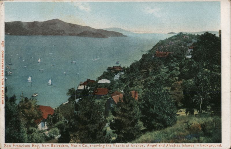 Front: BRITTON & REY, SAN FRANCISCO 589 San Francisco Bay, from Belvedere, Marin Co., showing the Yachts at Anchor. Angel and Alcatraz Islands in background. Back: So Puent Card Two CENTS