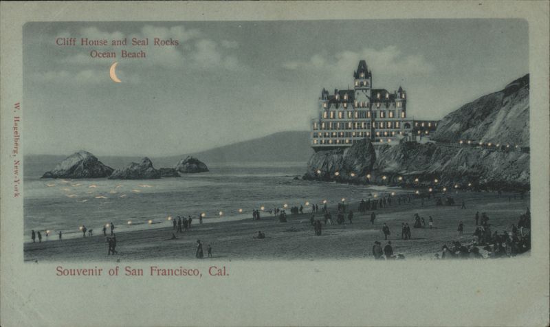 Front: Cliff House and Seal Rocks Ocean Beach W. Hagelberg, New-York Souvenir of San Francisco, Cal. Back: PRIVATE MAILING CARD. (AUTHORIZED BY ACT OF CONGRESS OF MAY 19,1898.) POSTAL CARD. CARTE POSTALE. THIS SIDE FOR THE ADDRESS.