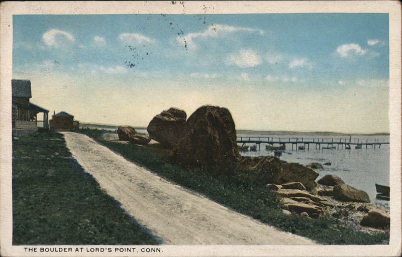 Front: THE BOULDER AT LORD'S POINT, CONN. Back: It is beautiful down here 920 PO CONN today. We all I. & M. N.Z. Smith like it very Much Lan-Maruni 98 Main St. Norint Conn. m