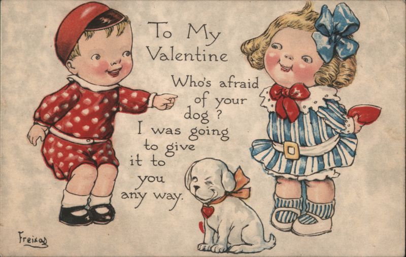| A boy in a red and white polka dot outfit points at a girl in a blue and white striped dress, while a small white dog with a heart-shaped tag sits between them. The boy says, "To My Valentine Who's afraid of your dog? I was going to give it to you any way." |
