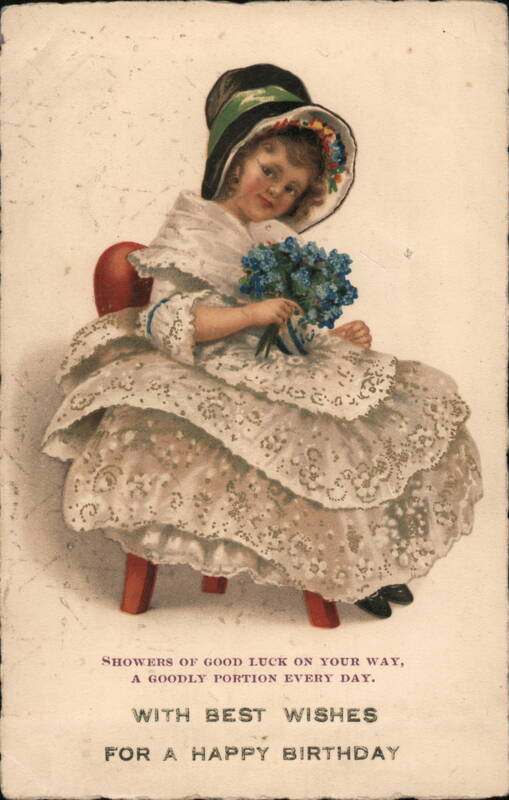 Front: SHOWERS OF GOOD LUCK ON YOUR WAY, A GOODLY PORTION EVERY DAY. WITH BEST WISHES FOR A HAPPY BIRTHDAY Back: YACHTRIE YESAH A.ROF ear 4H BEEL MICHEZ ын Hope on one usts quiti will with best wishes I love from Auntie Eric 75 8243