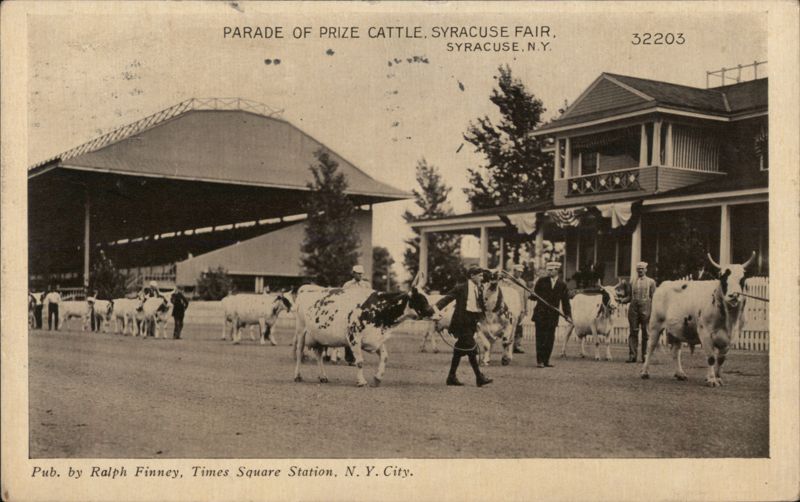 Front: PARADE OF PRIZE CATTLE, SYRACUSE FAIR, SYRACUSE, N.Y. Pub. by Ralph Finney, Times Square Station, N. Y. City. 32203 Back: SYA 1910 Bisisniss Good Fair in grat M.= am Auburn my. This side for the Address only