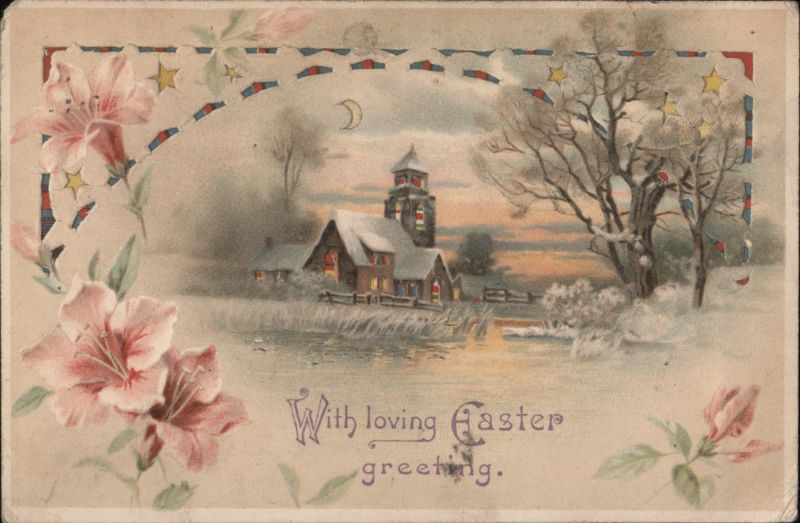 An idyllic scene of a church at sunset, adorned with Easter greetings. Pink flowers frame the image, adding to the festive atmosphere.