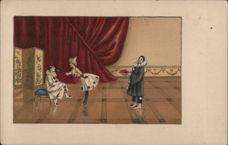 Two clowns in a dressing room, one seated and the other bowing, while a third clown enters carrying a tray of refreshments.