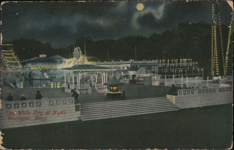 Front: ********* The White City at Night. Worcester, Mass EXP Back: 15008 Publ. by The Metropolitan News Co., Boston. 15 To to Silas Gertrude TWO CENTS