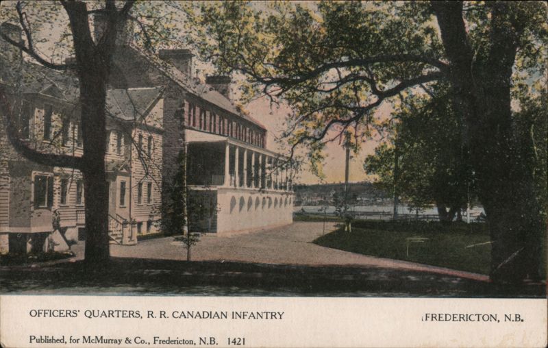 Front: OFFICERS' QUARTERS, R. R. CANADIAN INFANTRY Published, for McMurray & Co., Fredericton, N.B. 1421 FREDERICTON, N.B. Back: AND US. ABROAD, TRADE MARK THIS SPACE FOR ADDRESS ONLY.