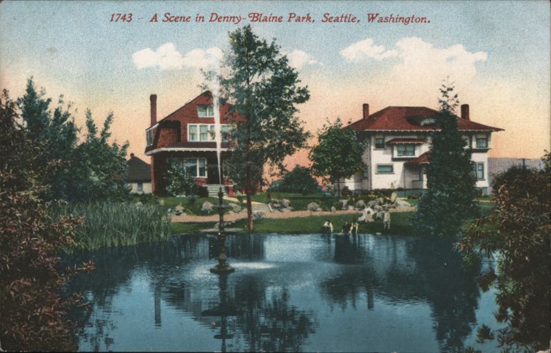 Front: 1743 A Scene in Denny-Blaine Park, Seattle, Washington. 泥黏 Back: >1¢ 2¢ PUBLISHED BY EDW. H. MITCHELL, SAN FRANCISCO ONLY