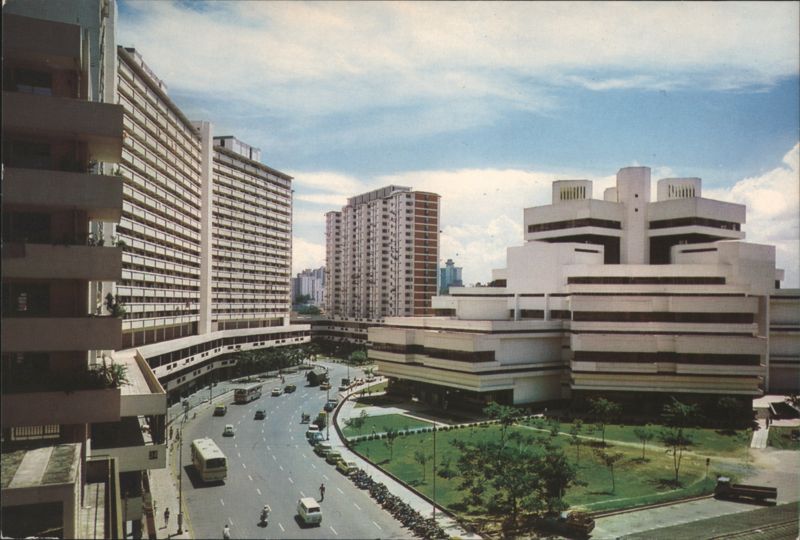 Housing Board flats on left, with New Lower Court Building on right, at Upper Cross Street, Singapore. S7635 PUB. BY:- S. W. SINGAPORE HERE