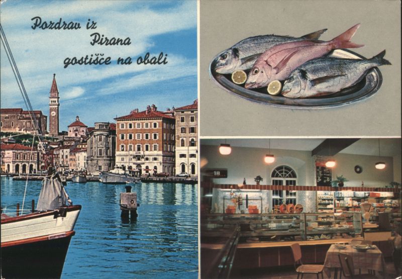 Front: Pozdrav iz Pirana gostišče na obali 000 18 Back: FOTO Oreha K-181 IZDAVAČ Oreha SPLIT PRINTED BY SAGI TRIESTE