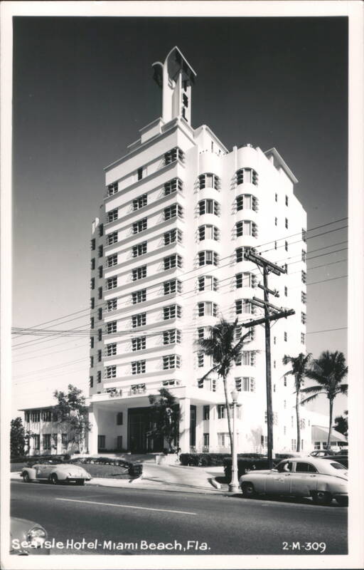 View of the Sea Isle Hotel from across the street. Several cars are parked along the street and driveway.