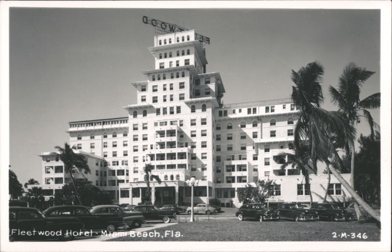 The Fleetwood Hotel, a prominent landmark in Miami Beach, stands tall against the backdrop of a clear sky. Its white facade, punctuated by numerous windows and balconies, exudes an air of elegance. Several cars are parked in front, adding to the scene's vintage charm. Palm trees sway gently in the foreground, enhancing the tropical ambiance. |